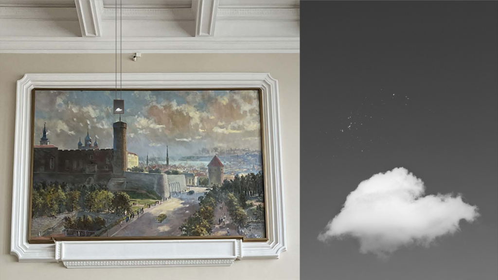 2. In front of the red flag on the tall Hermann Tower, hang the work Waiting Room Improvisation, which is a black and white photograph of a cloud. Waiting Room Improvisation is a work I created for the Artishok Biennale (2016), which originally dealt with the potential hidden in boredom. I think this work also fits the title of the work, because in the original it was about a waiting room.