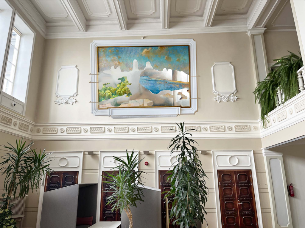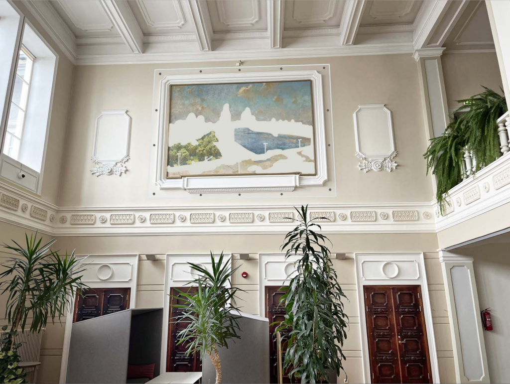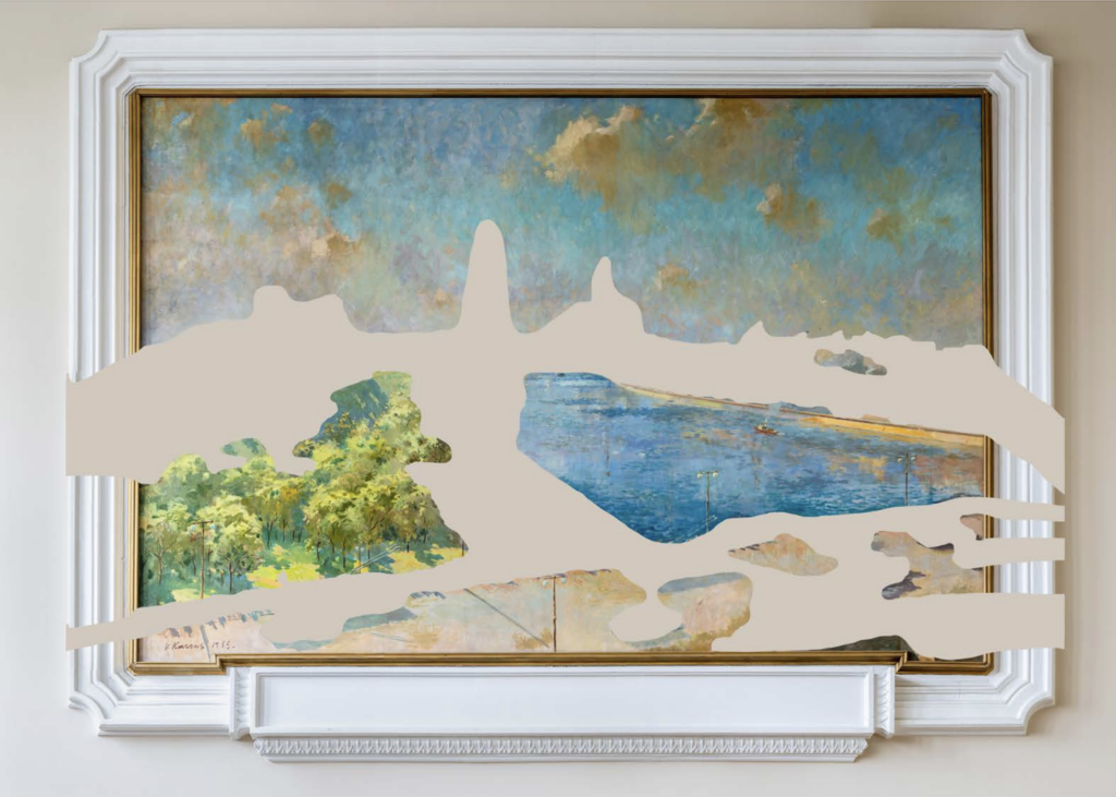 As a solution, I propose some visual overwriting techniques that allow the original artwork created in a specific interior to continue to exist in its place and at the same time to essentially fit into today. The visual image of all the proposed overwriting techniques is similar, resulting from the desire to remove the power symbols of the aggressor state from the painting and to make the depicted place anonymous.