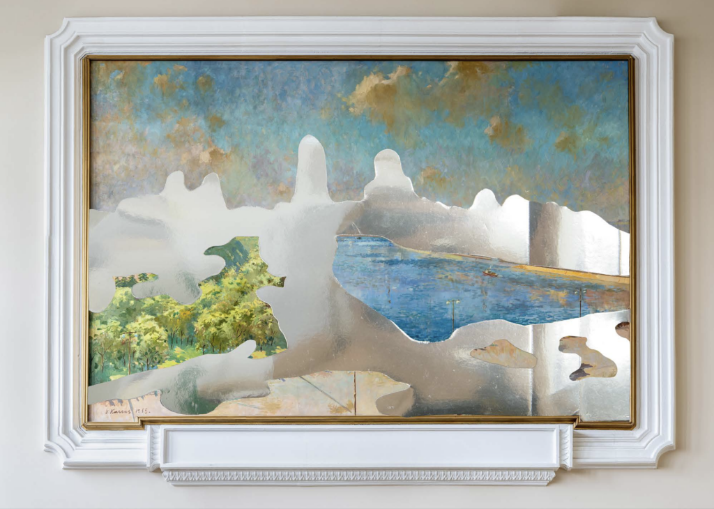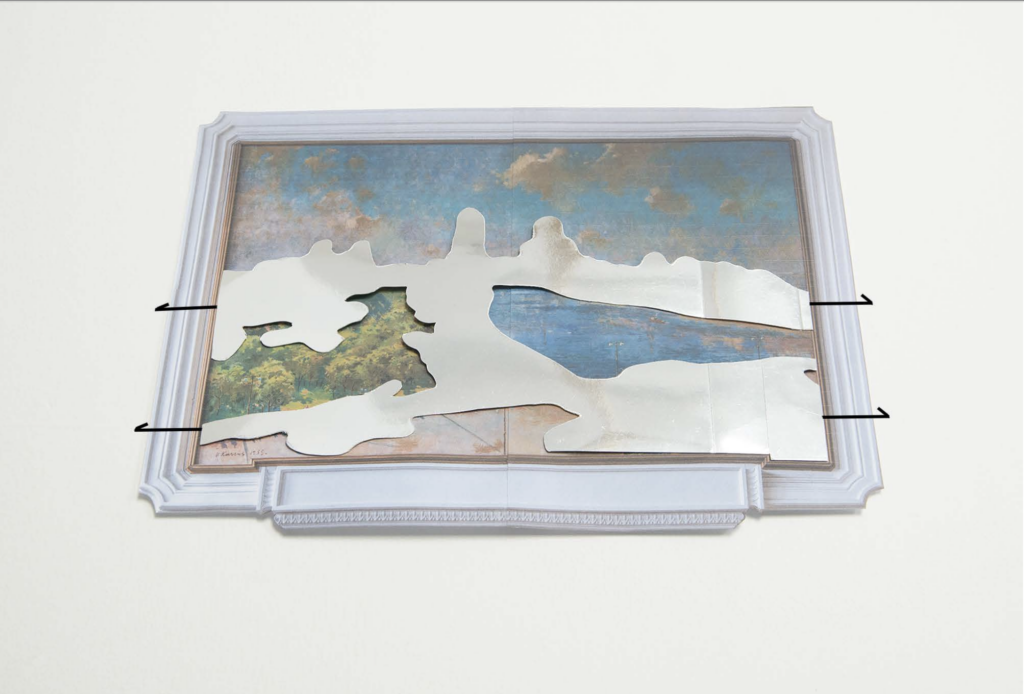 The use of mirror material (or other material with a reflective surface) places an additional layer on top of the view depicted in the painting (overwrites) the existing space and light, the situation of the moment. The reflection and mirror surface of real space are changing. There is openness and layering in the change, a contrast to the black-and-white worldview. It is no longer a specific place, nor a form depicting something specific. It is a filled and empty space at the same time. Despite the substantive gravity of the original work, the resulting abstract form also allows for a freer flight of fantasy and a certain lightness. Reflections from the past are overwritten by the present.
