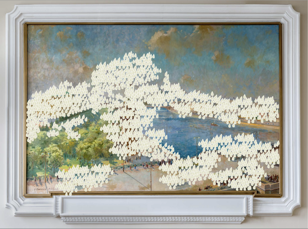 Drawn on a glass surface in front of the painting or as clay objects (x amount of tears, attached to a metal structure in front of the painting). Making “tears” could be a collective creation and discussion. Tears were used as symbols of the complexity and difficulty of the situation, but also as a confrontation with a “strong” aggressor. The courage to be vulnerable. Tears of sadness become tears of joy, tears of liberation, tears of liberation.