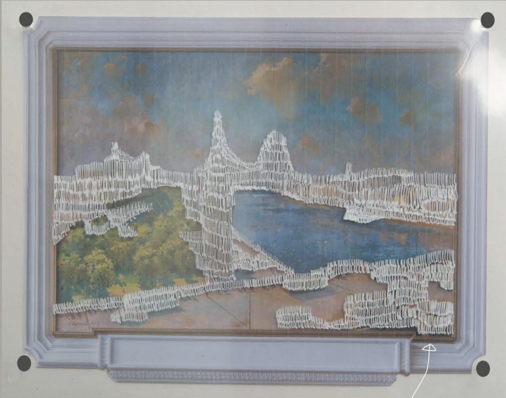 - Specially shaped fabric/canvas/plate material stretched on a base frame in front of the original painting.